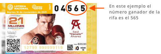 El numero ganador de la rifa será el que coincida con los últimos números del ganador de sorteo mayor de la Lotería Nacional  de la fecha designada.
